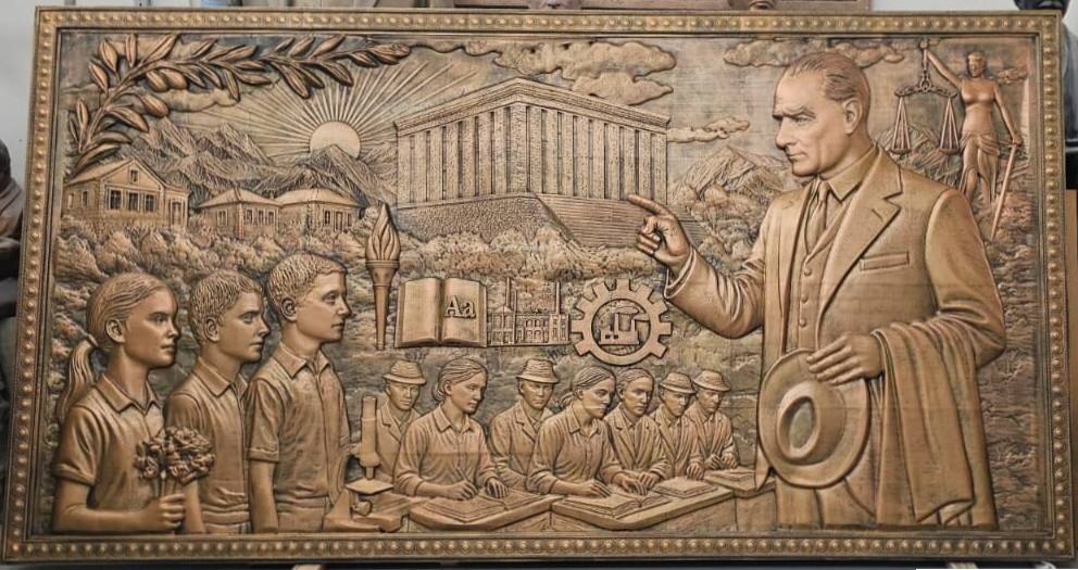 Yüksek kabartma (rölyef) tekniği ile üretilen bu eser; estetik, derinlik ve detay zenginliği açısından bulunduğu mekâna güçlü bir karakter kazandırır. Okullar, kamu kurumları, belediyeler ve özel projeler için prestijli bir sanat eseri niteliğindedir.