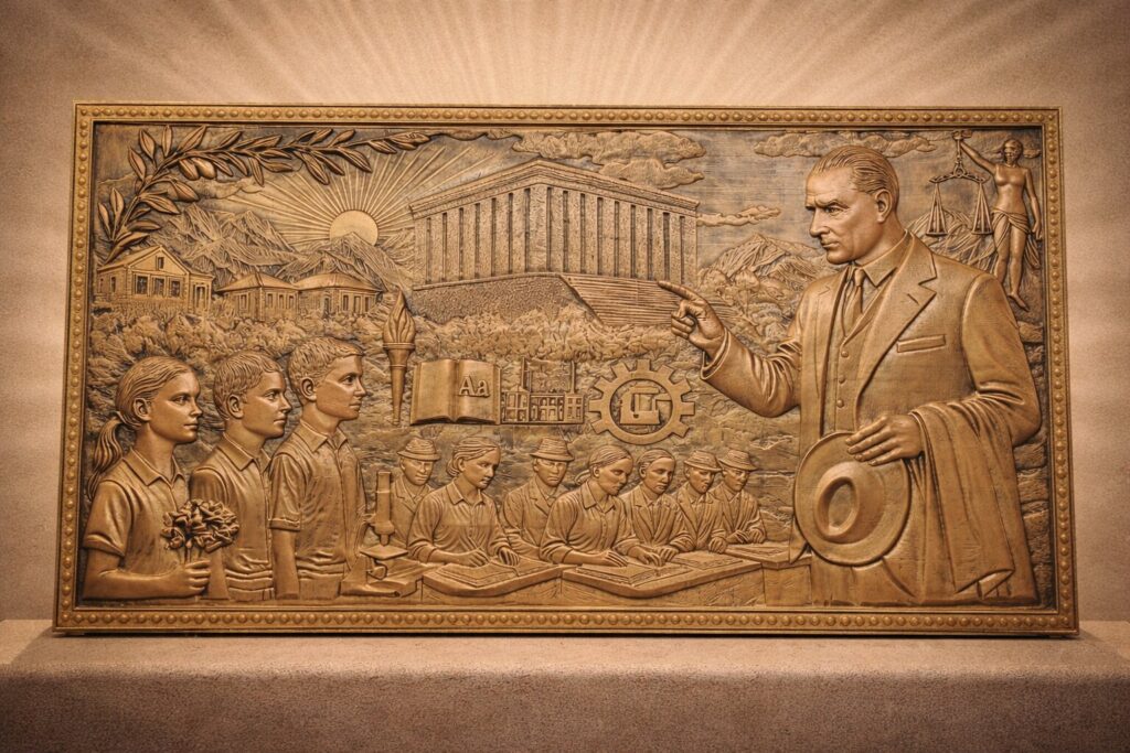 Rölyefte Atatürk’ün yön gösteren lider kimliği, karşısında yer alan öğrenciler ve eğitim sahnesi ile birlikte ele alınmış; arka planda yer alan mimari ve simgesel detaylarla Cumhuriyetin çağdaşlaşma vizyonu vurgulanmıştır. Kompozisyonda kitap, meşale ve endüstri sembolleri; bilim, eğitim ve üretim odaklı bir toplum idealini temsil etmektedir.